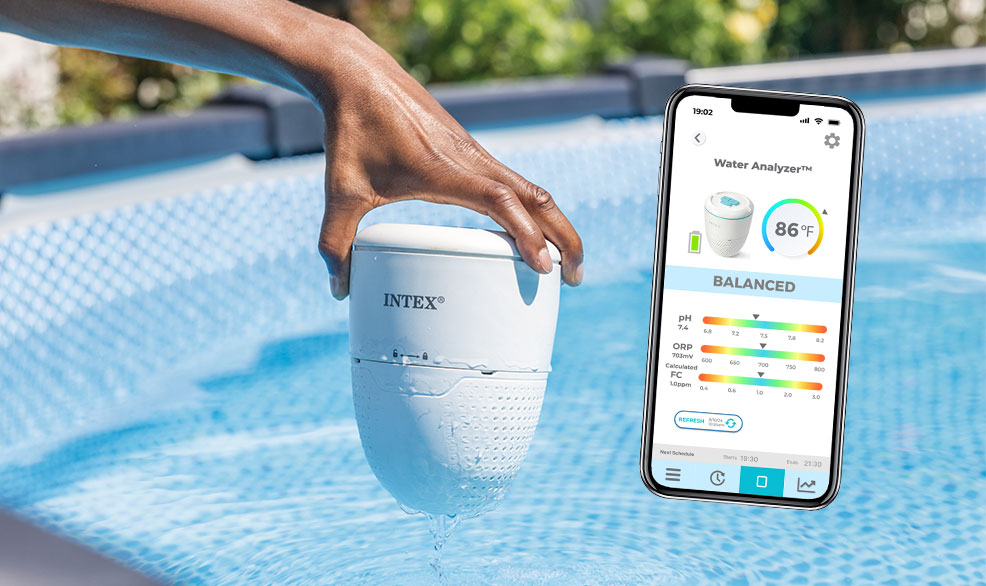 Conçu pour vous faire gagner du temps tout en réduisant votre consommation de produits chimiques, Intex vous présente son nouvel analyseur d'eau connecté. Dites adieu aux dosages approximatifs : vous intervenez uniquement lorsque c'est nécessaire, pour une eau saine, équilibrée et parfaitement maîtrisée.