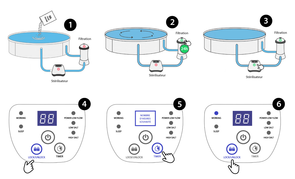 - Que votre épurateur à cartouche ou votre filtre à sable soit en marche. Sinon, votre stérilisateur ne peut pas fonctionner.