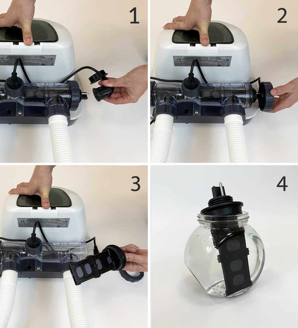 La cellule électrolytique de votre électrolyseur Intex se charge de transformer le sel en chlore par un procédé électrochimique. C’est pourquoi, il est fortement conseillé de la nettoyer régulièrement pour éviter qu’elle ne s’encrasse.