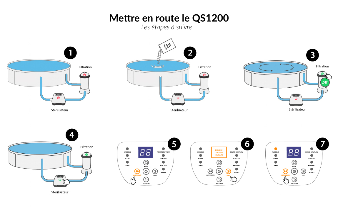 Comme tous les électrolyseurs au sel Intex (aussi appelés stérilisateurs), le QS1200 désinfecte l’eau de votre piscine par le traitement au sel. Pour vous faciliter la tâche, il peut être programmé pour se mettre en route automatiquement chaque jour à la même heure. Cliquez ici pour en savoir plus sur le fonctionnement de l'électrolyse au sel.