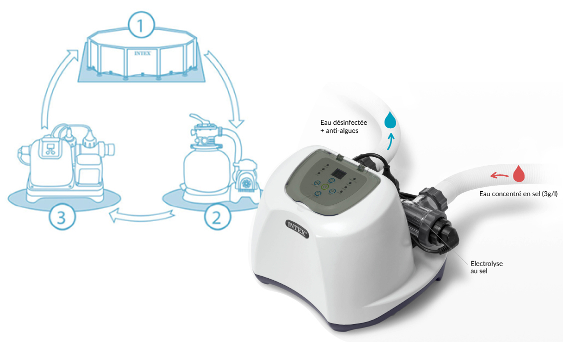Étape 1 : Vous raccordez votre stérilisateur d’une part à votre système de filtration, d’autre part à votre piscine et vous ajoutez du sel dans votre bassin (3g/l)