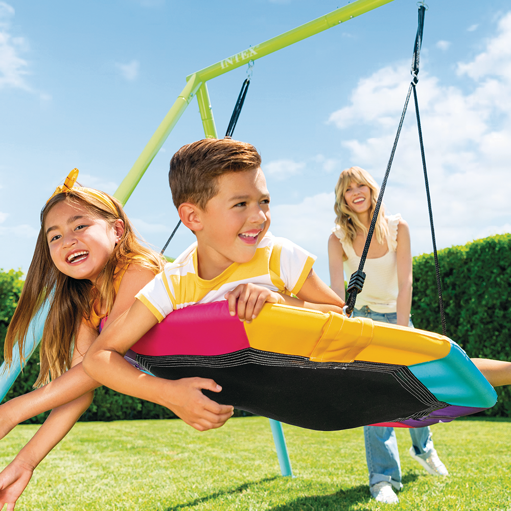 Ce portique-balançoire Intex est coloré et amène de la gaieté à votre extérieur. Les couleurs attractives séduiront sans doute vos enfants. Ils pourront profiter pleinement de leur nouveau terrain de jeu design sans risquer de se blesser avec les chaînes des balançoires, fabriquées en plastisol pour plus de confort et de durabilité. Laissez vos bambins s'amuser sur le nid d'oiseau dès 3 ans en ajustant les cordes de fixation à leur taille.